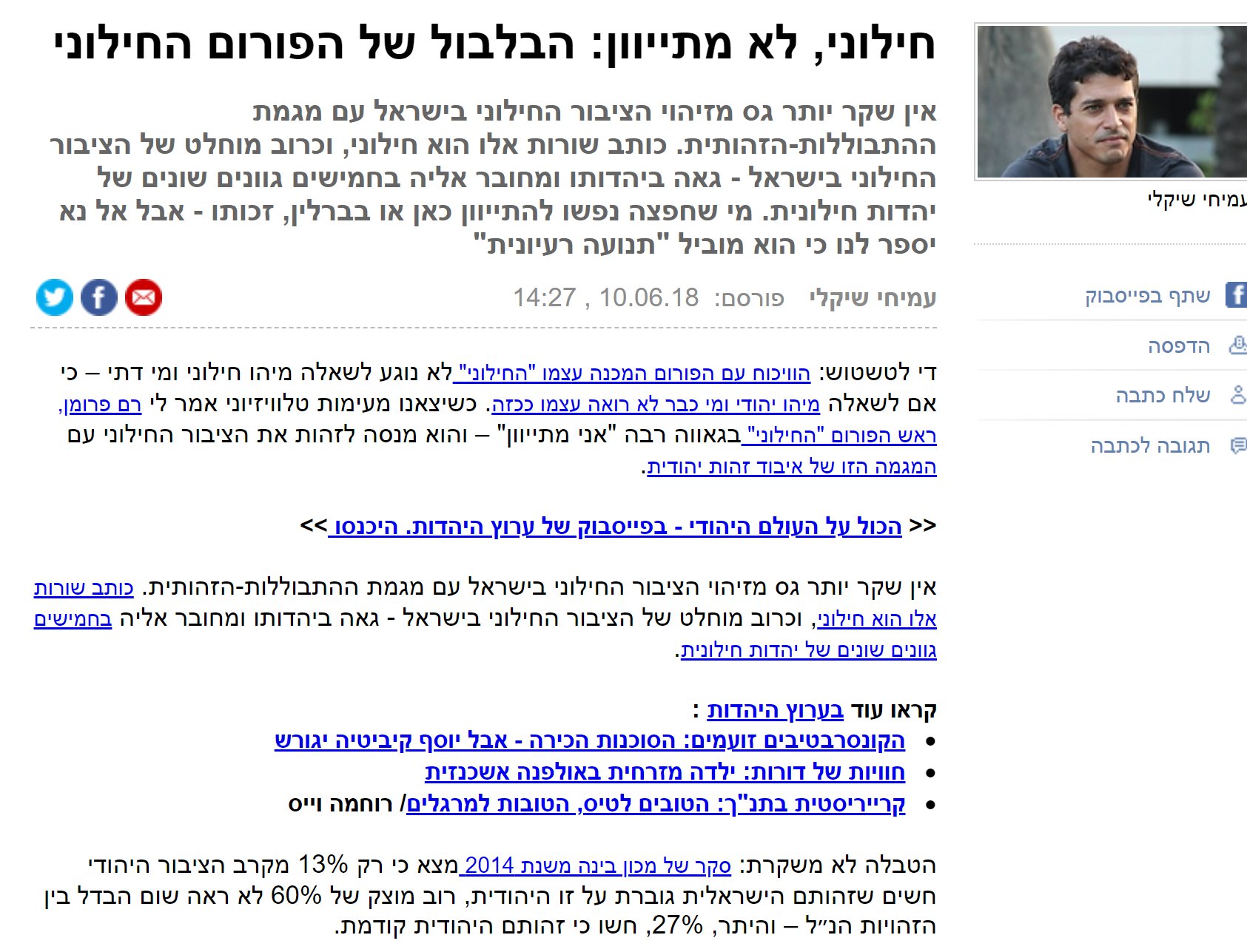 אורי קול תוקף באיראן On Twitter בפוסט אחר העמוד משתף מאמר של עמיחי שיקלי בו הוא כותב הויכוח עם הפורום החילוני לא נוגע לשאלה מי דתי ומי חילוני כי אם לשאלה מיהו